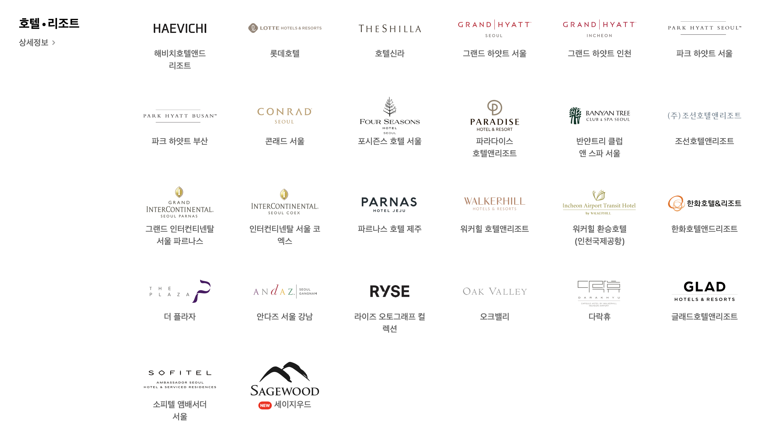 해비치호텔랜드리조트, 롯데호텔, 그랜드 하얏트 서울, 파크 하얏트 서울, 파크 하얏트 부산, 콘래드 서울, 파라다이스호텔앤리조트, 반얀트리 클럽 앤 스파 서울, 조선호텔앤리조트, 그랜드 인터컨티넨탈 서울 파르나스, 인터컨티넨탈 서울 코엑스, 파르나스 호텔 제주, 워커힐 호텔앤리조트, 워커힐 환승호텔(인천국제공항), 환화호텔앤드리조트, 더 플라자, 안다즈 서울 강남, 라이즈 오토그래프 컬렉션, 오크밸리, 다락휴