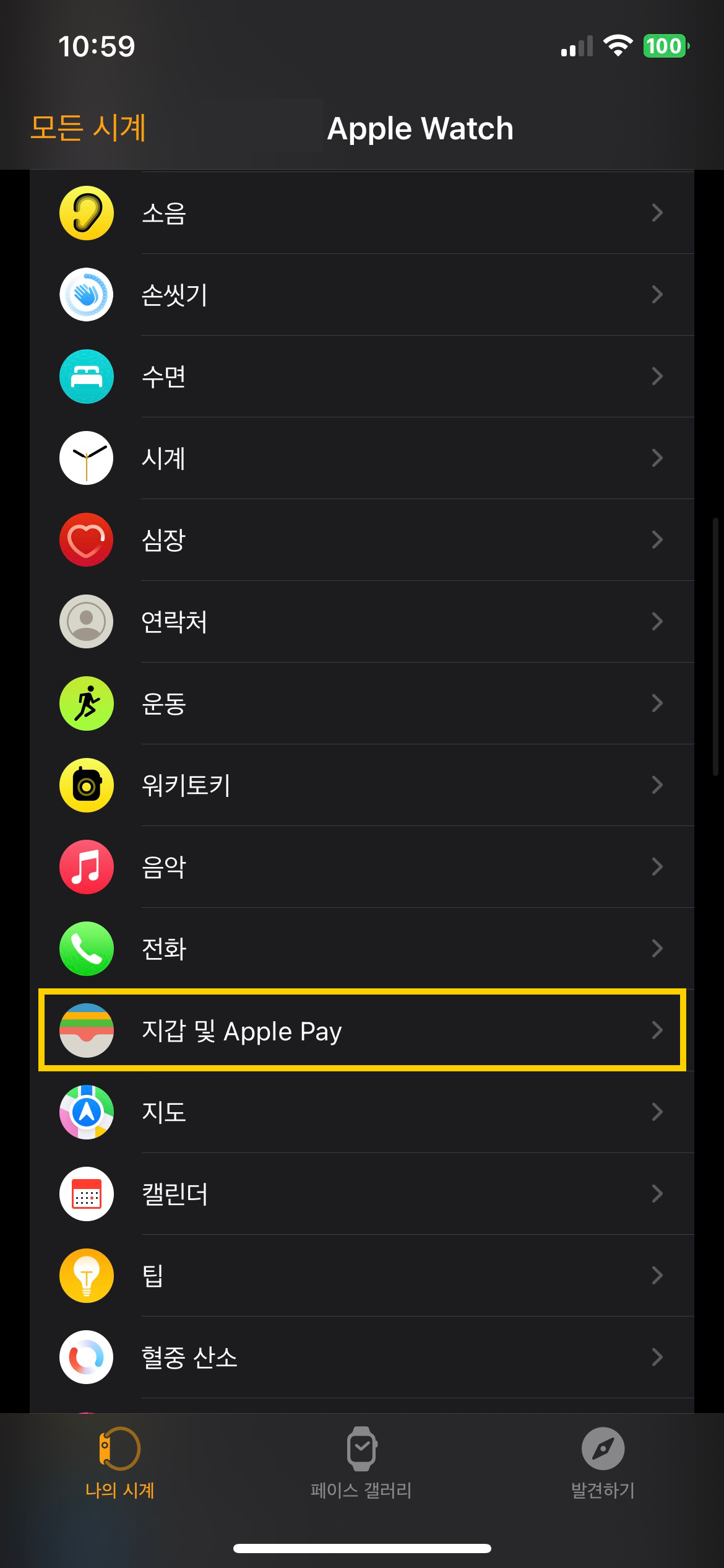 이 외로 애플워치를 사용하는 분들은 카드 등록이 완료된 후에 아이폰의 Watch 앱에 들어가면 하단 리스트에 지갑 및 Apple Pay라는 선택 리스트가 있다. 들어가면 지갑어플에 등록한 카드가 뜨고 우측에 + 버튼이 있다. + 버튼을 눌러 등록하면, 애플워치에서 전원버튼을 2번 클릭하여 애플페이를 사용할 수 있다.